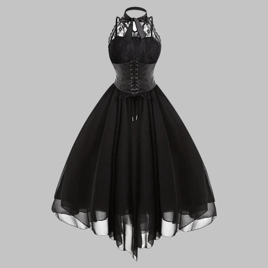 Robe Victorienne Noire Sans Manches avec Dentelle et Tulle
